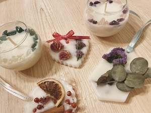 体験レッスンでは”ローズコルネキャンドル”に加え、”ハーブの丸型アロマプレート”を作ります。
